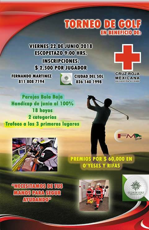 Allende. – El próximo viernes 22 de junio se llevará a cabo un torneo de golf en La Ciudad del Sol a beneficio de la Cruz Roja Mexicana delegación Allende.