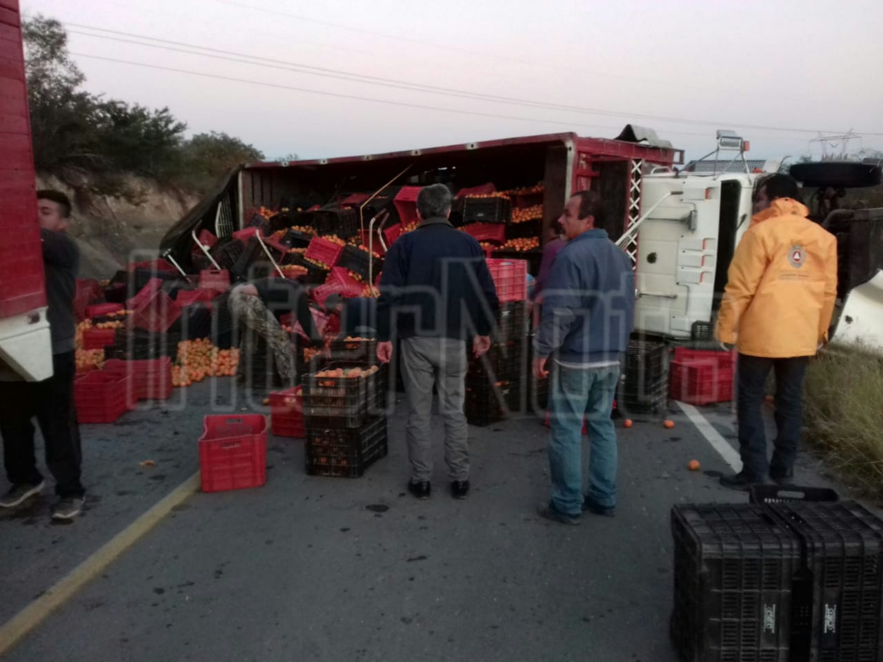 General Terán_ Un tactocamión que transportaba cítricos volcó sobre la carretera a San juan Cadereyta en el km 15 donde el conductor quien no proporciono su nombre argumento que le gano la carga perdiendo el control para posteriormente terminar volcado.