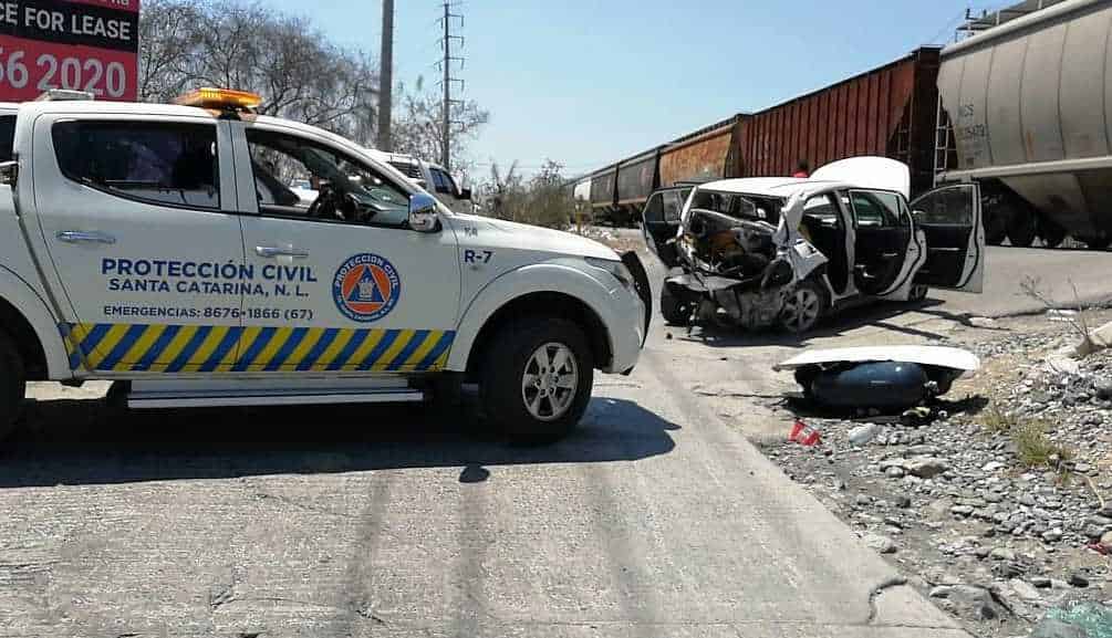 LE INTENTA GANAR AL TREN Y PROVOCA APARATOSO ACCIDENTE. Santa Catarina.- Un automovilista sufrió un fuerte accidente luego de que...