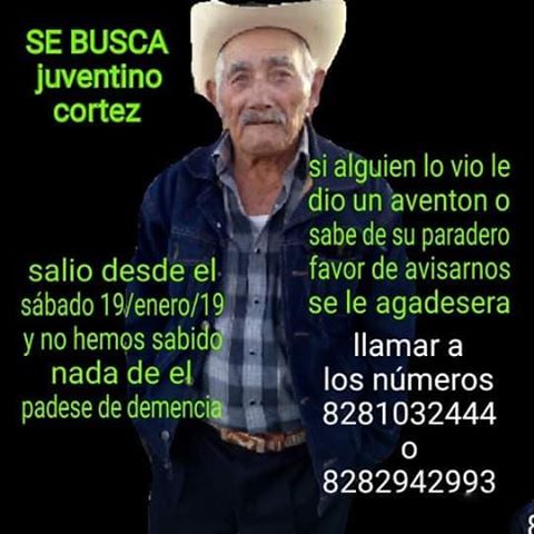 Se solicita de su ayuda para localizar a Juventino Cortez tiene 83 años de edad, quien desde hace 5 meses...