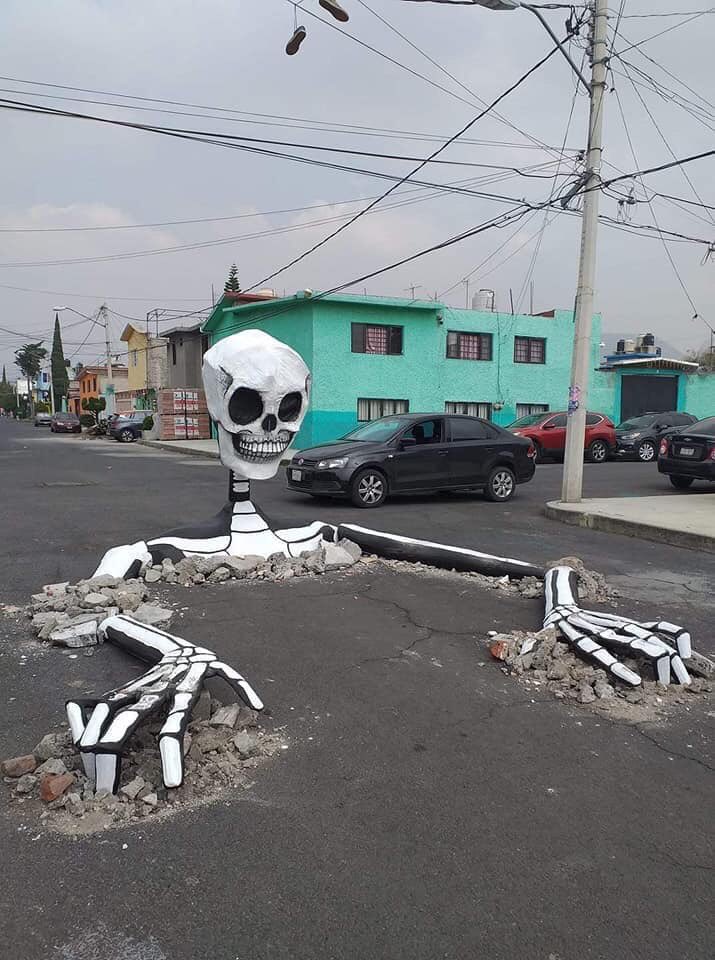 #ENLOVIRAL ADORNAN BACHES CON CALAVERA GIGANTE. CDMX.- vecinos aprovecharon los baches adornándolos con una calavera gigante alusiva al día de...
