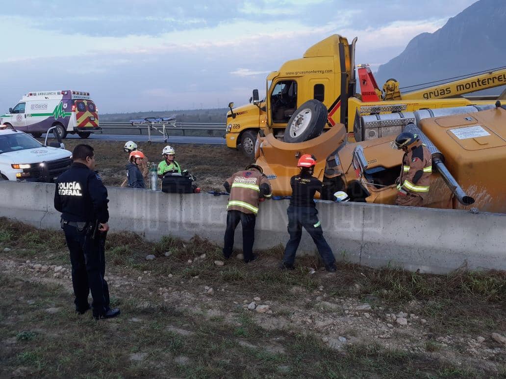 García – Una volcadura de un trailer que transportaba pintura deja una persona lesionada y el cierre parcial de la carretera. Los hechos se registraron en la Carr. de cuota Autopista Monterrey Saltillo Km 18, García N.L. Al lugar llegan elementos de Protección Civil Nuevo León, García, Bomberos Nuevo Leon así como Fuerza Civil y CAPUFE quienes realizaron las labores correspondientes. El conductor fue trasladado a los servicios médicos del IMSS