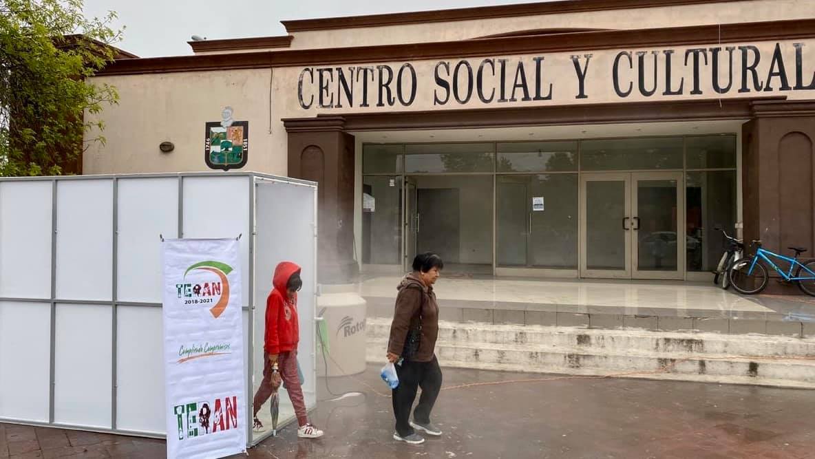 General Terán_ El día de hoy, mediante una gestión realizada por el presidente municipal de General Terán, Eleuterio Villagómez Guerrero, se instaló una cabina sanitizante en las afueras del Centro Social y Cultural, con la finalidad de que la utilicen todas las personas que están acudiendo al pago de giro por parte del programa 68 y más, del Adulto Mayor.