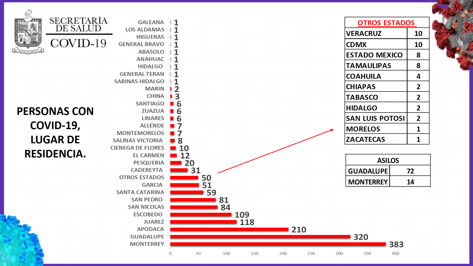 El día de hoy el Secretario de Salud del Estado, Manuel de la O Cavazos, dio a conocer las nuevas cifras de casos positivos de COVID-19 en el estado de Nuevo León, en donde se agrega un nuevo caso en el municipio de Allende, sumando 7 casos en total y también aparece en la gráfica el municipio de Galeana con un caso.