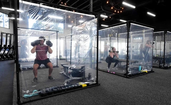 Cada cliente tiene su propio espacio, protegido por cápsulas de entrenamiento individuales, que se asemejan a peceras de plástico, para...