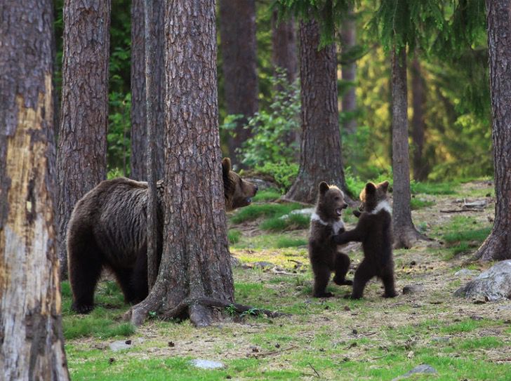 Durante un viaje a la taiga finlandesa se topó con unos pequeños cachorros de oso, de inmediato se acercó con cautela para fotografiarlos. Al acercarse notó que hacían algo “raro”, estaban bailando en círculo como niños.