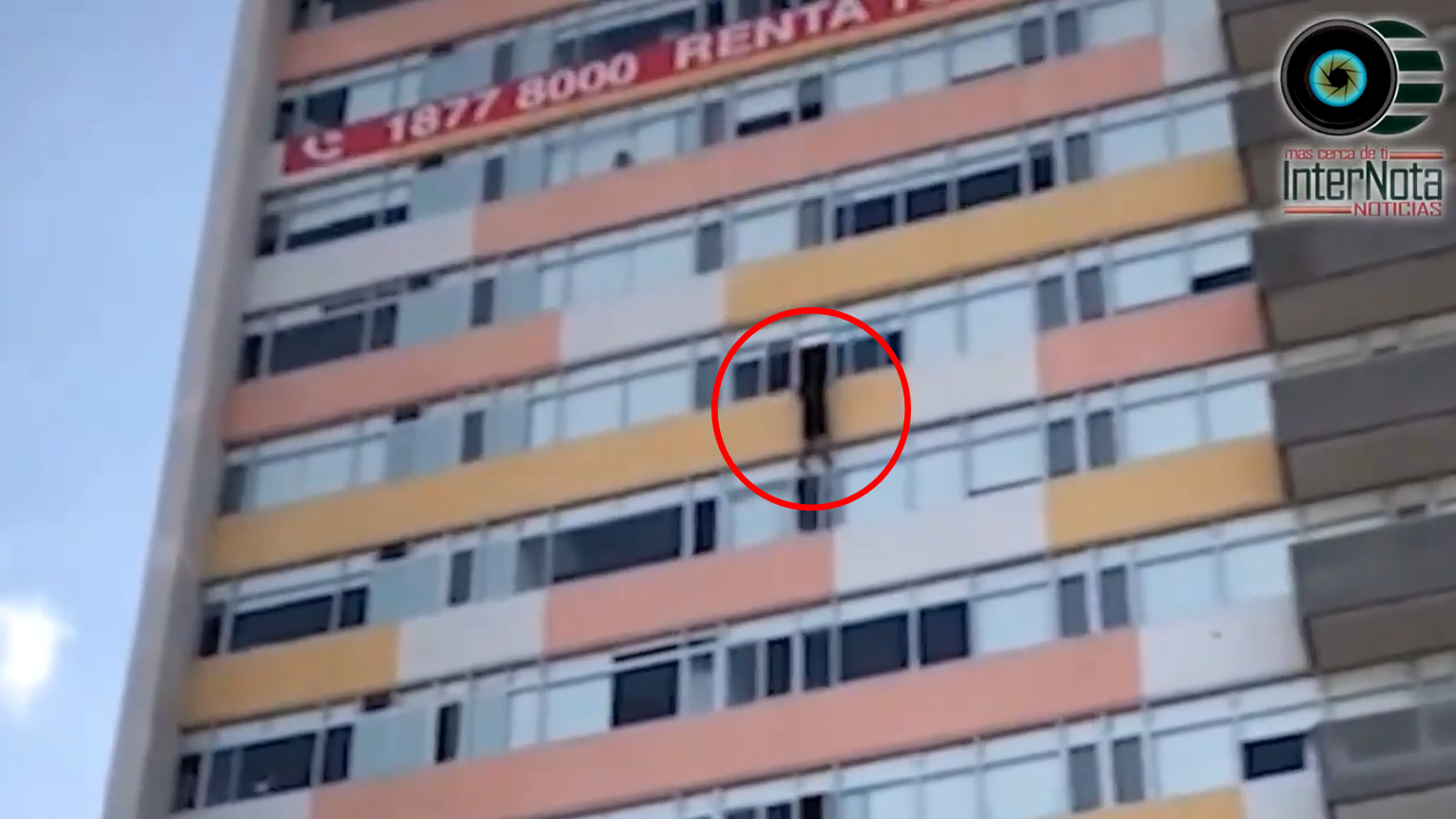 En un vídeo difundido en redes sociales un joven fue captado en un vídeo colgado de la ventana de un...