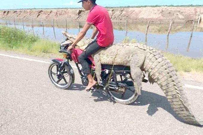 En la comunidad de Las Aguamitas Sataya, en Navolato, Sinaloa, un grupo de jóvenes atrapó a un cocodrilo vivo en el estero de Las Aguamitas y después de sacarlo del agua decidieron llevárselo en una motocicleta.