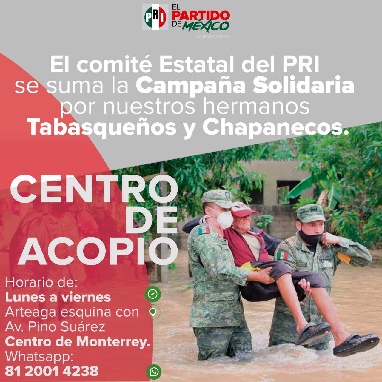 INSTALA PRI CENTRO DE ACOPIO PARA DAMNIFICADOS DE TABASCO Y CHIAPAS Apegados a los principios de apoyo a las causas...
