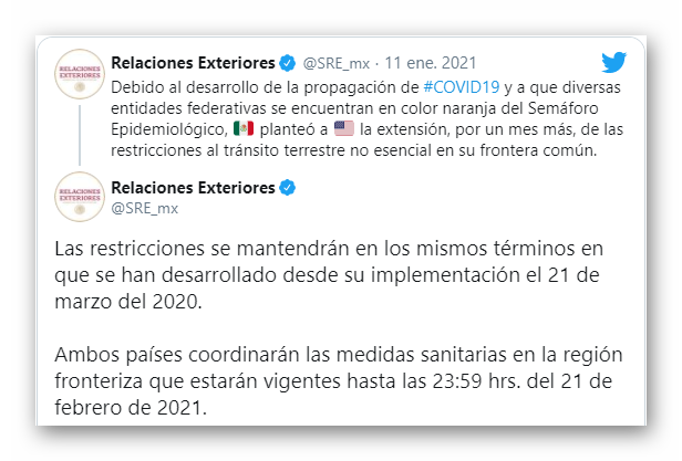 MÉXICO Y ESTADOS UNIDOS EXTIENDEN CIERRE DE FRONTERA HASTA EL 21 DE FEBRERO México. - La Secretaría de Relaciones Exteriores...