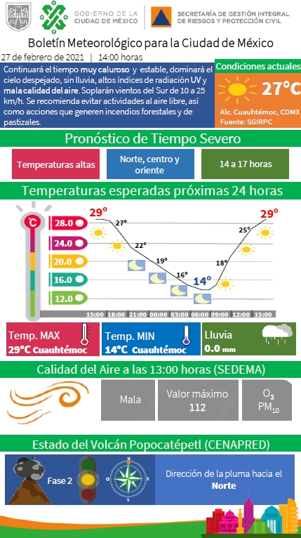 En la Ciudad de México, la Secretaría de Gestión Integral de Riesgos y Protección Civil activó la alerta amarilla debido a las altas temperaturas en las alcaldías Azcapotzalco, Benito Juárez, Coyoacán, Cuauhtémoc, Gustavo A. Madero, Iztacalco, Iztapalapa, Miguel Hidalgo y Venustiano Carranza.