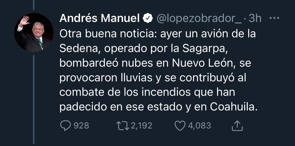 ATRIBUYE PRESIDENTE DE LA REPUBLICA ANDES MANUEL LÓPEZ OBRADOR LLUVIA EN SANTIAGO A BOMBARDEO DE NUBES POR PARTE DE LA SEDENA.
