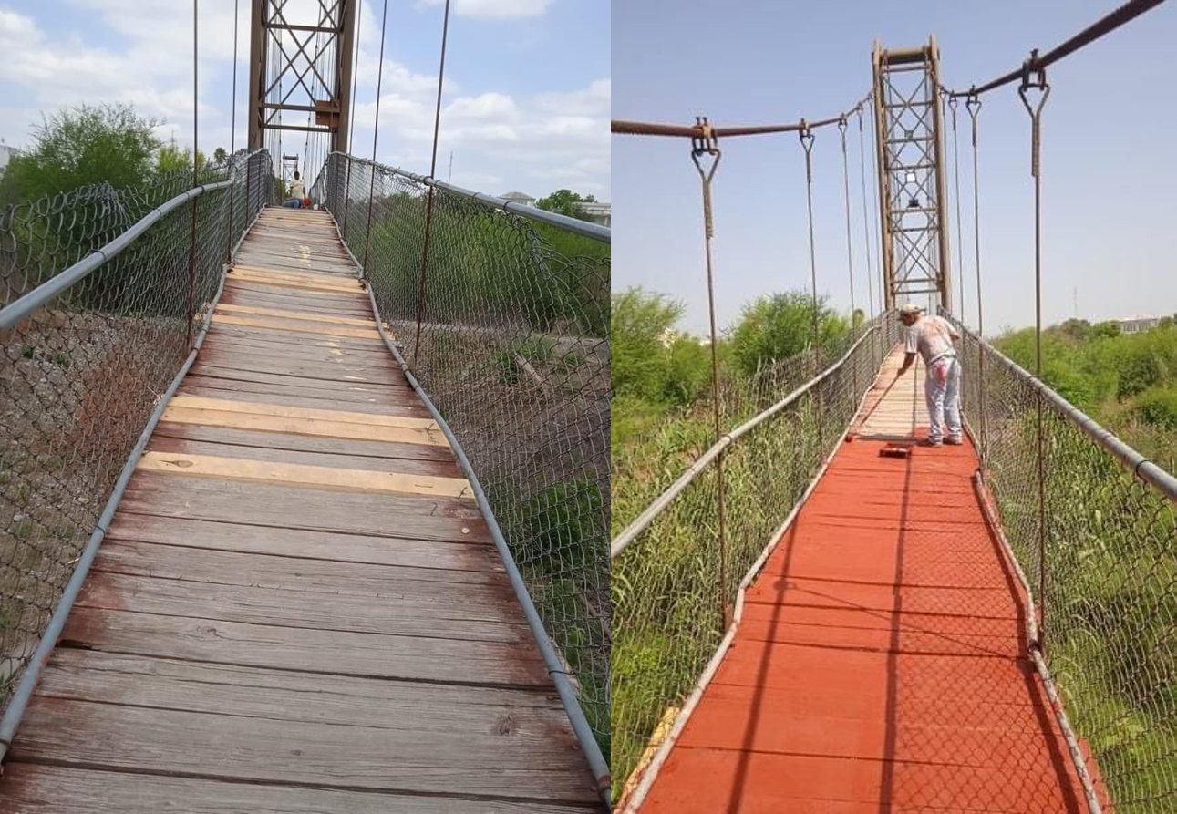 General Terán. – Por instrucciones directas del Alcalde Eleuterio Villagómez Guerrero, personal de Obras Públicas se avocó a realizar trabajos de reparación y remozamiento al Puente colgante que comunica al centro de la cabecera municipal con la comunidad de Santa Ana Nuevo y la Colonia Cavazos.