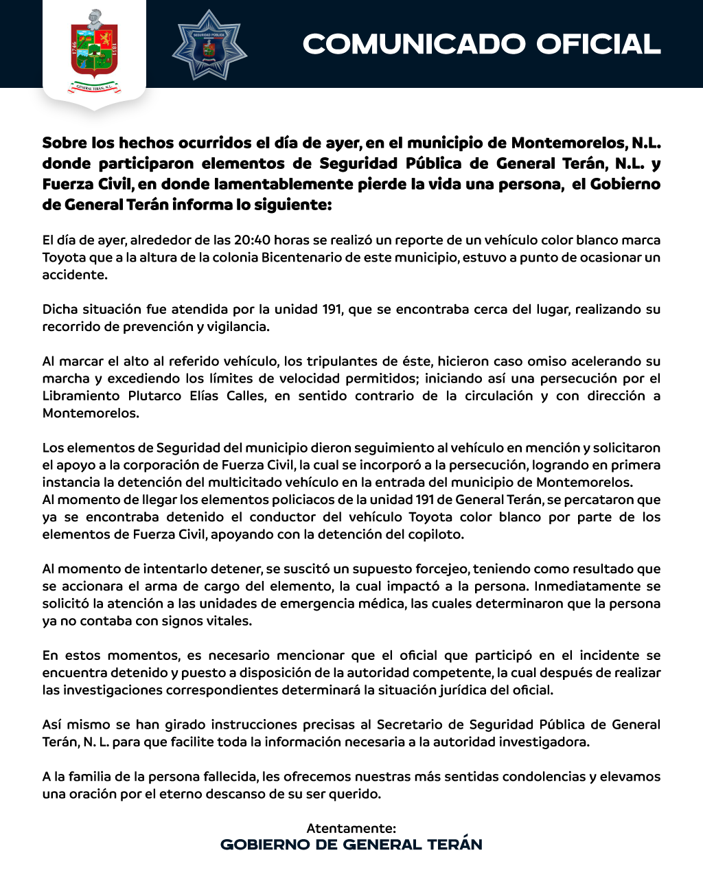 General Terán. –Durante la mañana del día de hoy se recibió el reporte a las instalaciones de protección civil de...