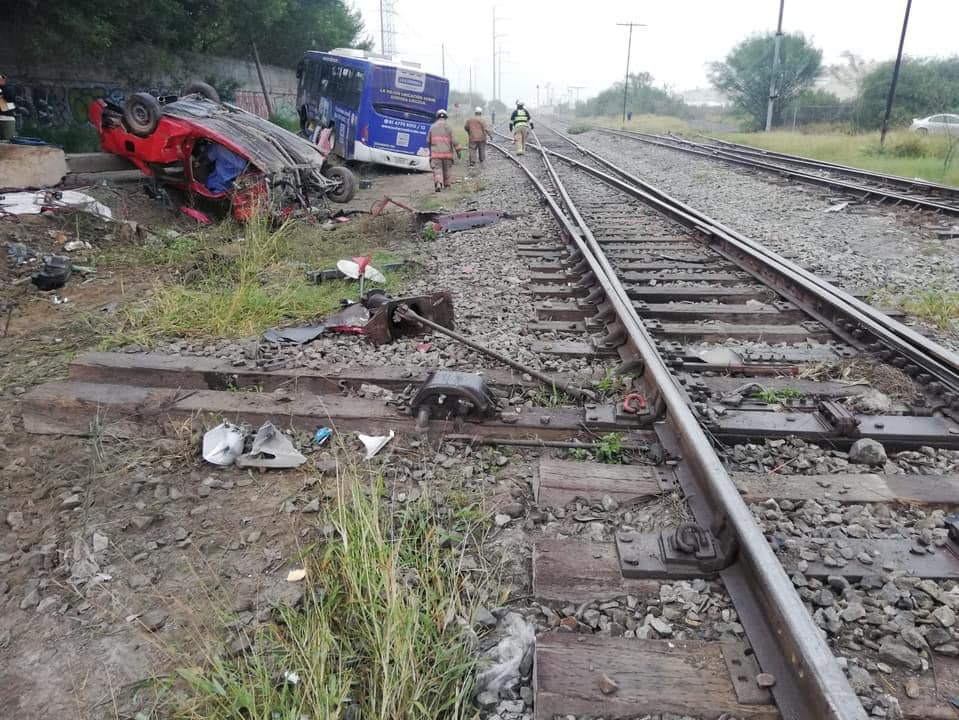 García.- Un fuerte accidente se registra en Carretera a García/Libramiento Noreste cuando el tren intercepta varios vehículos y son arrastrados dejando una persona fallecida y once lesionados. Elementos de Protección civil NL llegan al lugar para atender la las personas heridas .