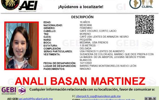 Solicitamos de su colaboración en apoyo al destacamento de la AEI Montemorelos para la LOCALIZACIÓN de ANALI BASAN MARTINEZ Fue...