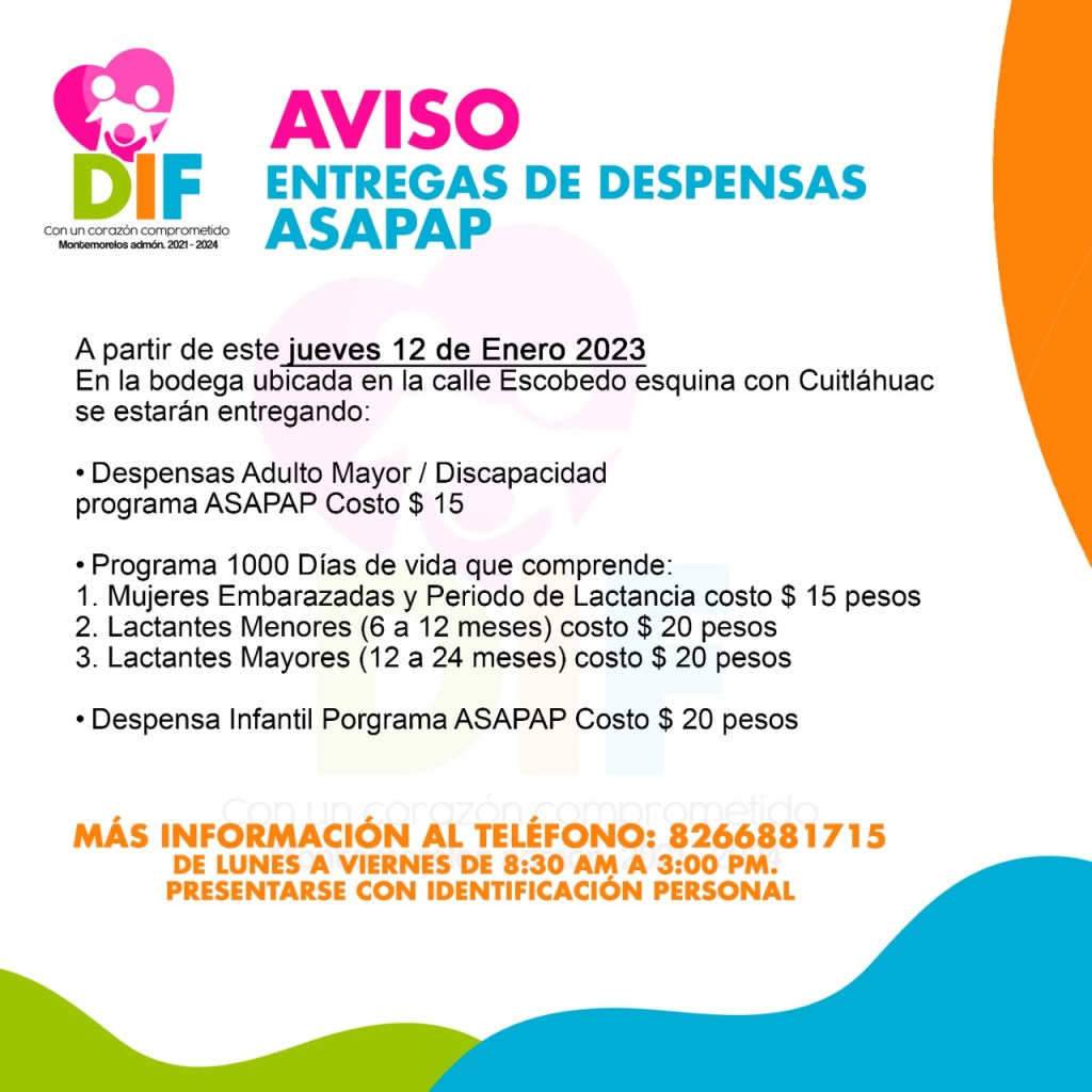El Gobierno Municipal de Montemorelos te comparte la siguiente información, dirigida a las beneficiarias del programa estatal de despensas ASAPAP: