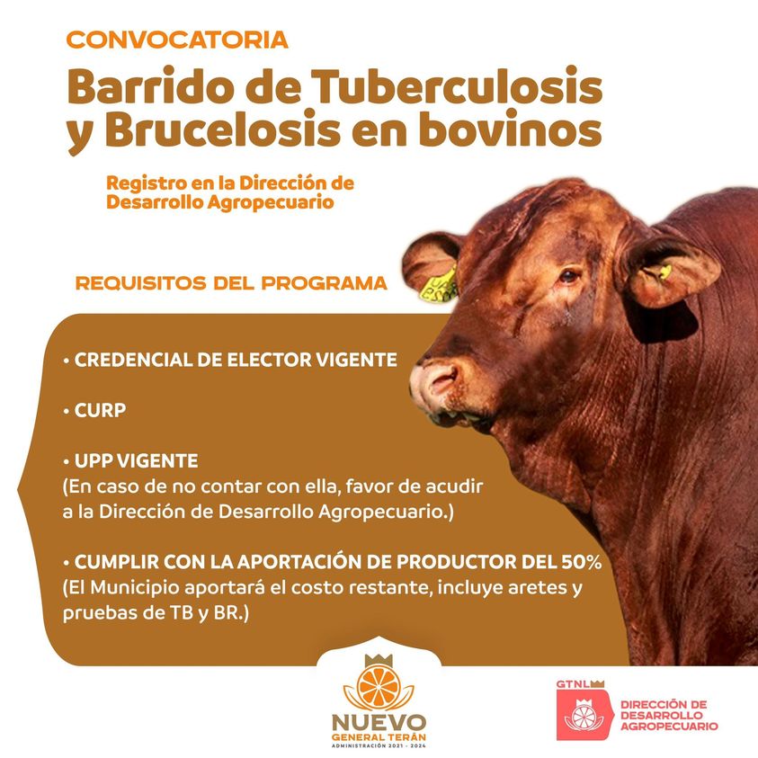 El Gobierno municipal de General Terán 2021-2024 a través de la Dirección de Desarrollo Agropecuario convoca a los ganaderos de nuestro municipio al Barrido de Tuberculosis y Brucelosis en bovinos.