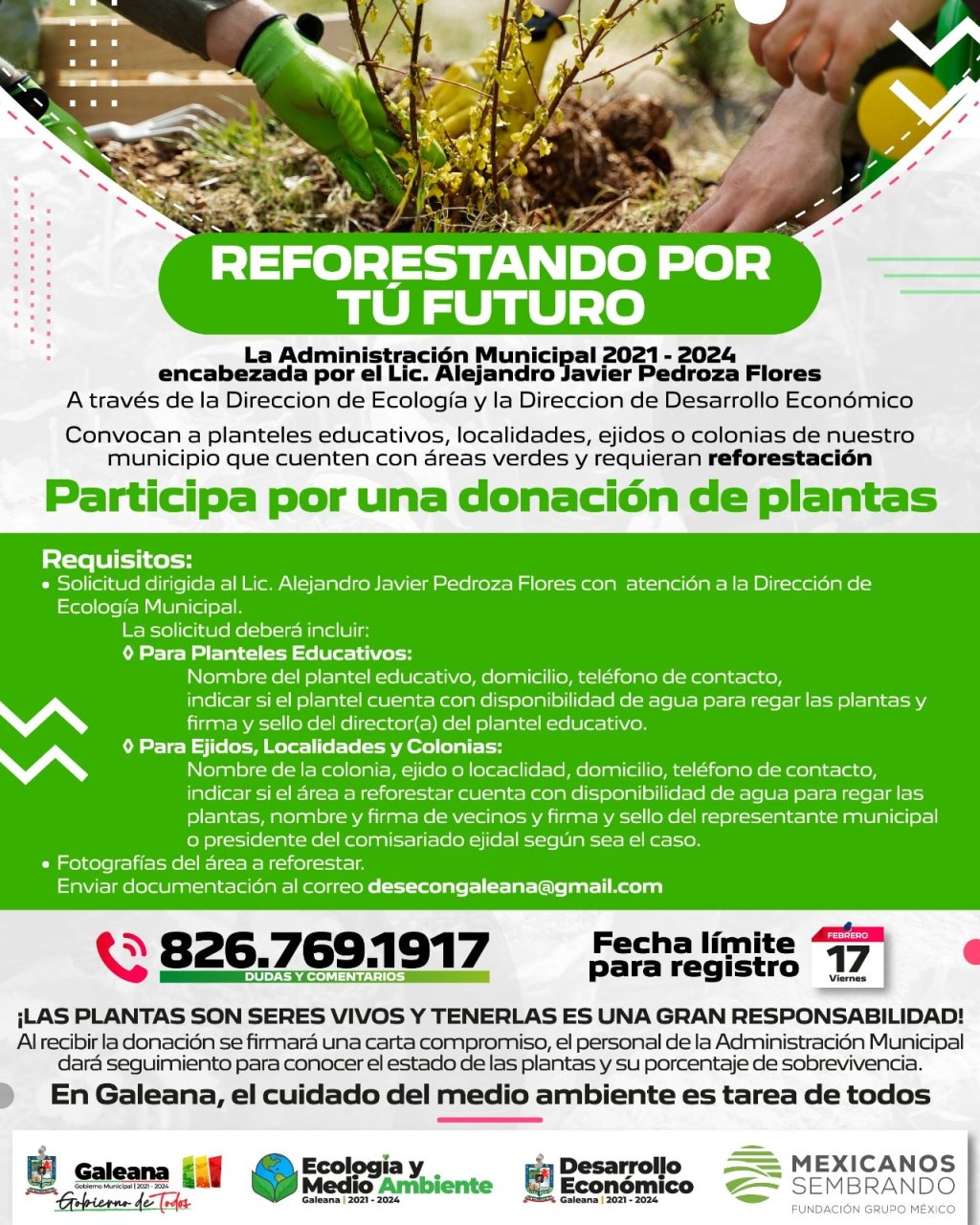 Es por eso el el gobierno municipal comparte la convocatoria para que junto con la ciudadanía se logre el objetivo de tener un Galeana más verde.
