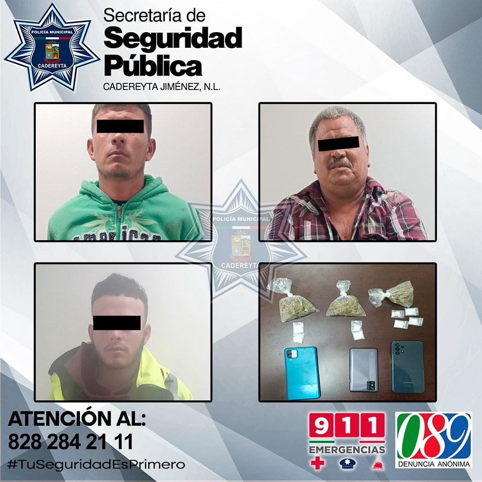 Cadereyta_ Oficiales de la Policía municipal de Cadereyta vislumbraron a dos masculinos durante el servicio de patrullaje en camino Tepehuaje la haciendita, quienes al ver la unidad oficial, emprenden la huida, dándoles alcance metros más adelante; se les realizó una inspección, y se les encontró múltiples envoltorios de hierba verde y seca con las características de la marihuana, así como varias bolsas de plástico conteniendo una sustancia con las características propias de la metanfetamina conocida como KRISTAL y diversos equipos de radiocomunicación, por lo que fueron detenidos respondiendo a nombres de: