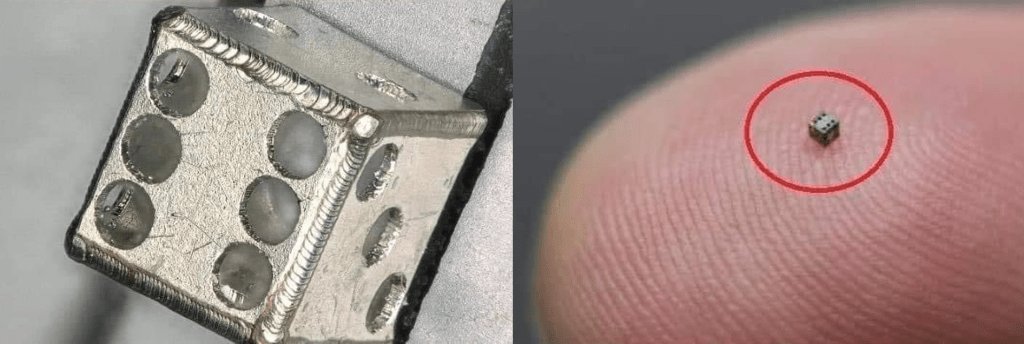 Estos trabajadores mostraron su habilidad con la soldadura, realizando un dado metálico de tan solo un milímetro con placas de acero inoxidable, con todas sus caras empaquetadas minuciosamente.