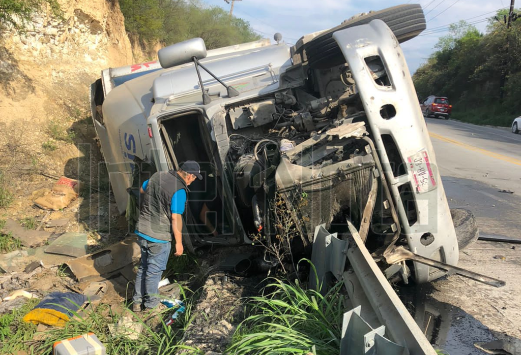 Tras perder el control en la pronunciada curva una unidad de carga termino por volcar e impactarse contra el barandal de seguridad ubicado a un costado de la vía.