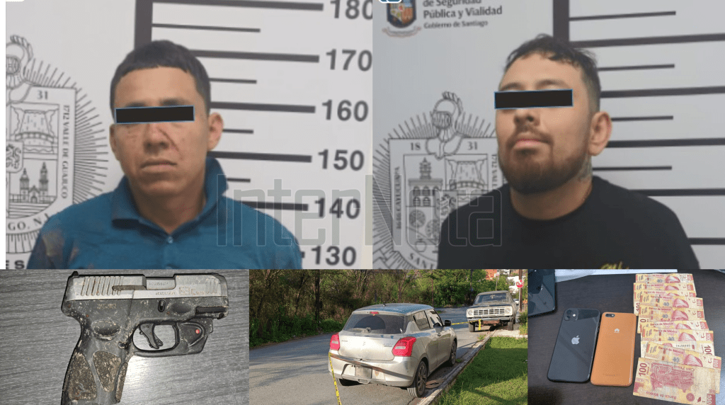 Santiago_ Dos hombres fueron detenidos por policías de la Secretaría de Seguridad Pública de Santiago luego de que asaltaron a mano armada a un hombre y a dos de sus trabajadores dentro del patio de su propiedad, mientras la esposa era testigo de los hechos desde el interior de su casa, en la Colonia San Pedro.