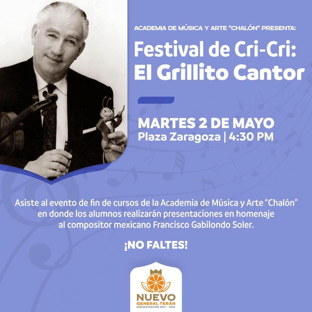 Acude este este martes 2 de mayo al evento de fin de cursos de la Academia de Música y Arte «Chalón», en la Plaza Zaragoza en punto de las 4:30 PM en donde los alumnos presentaran homenaje al compositor Francisco Gabilondo Soler. ¡No te lo pierdas!