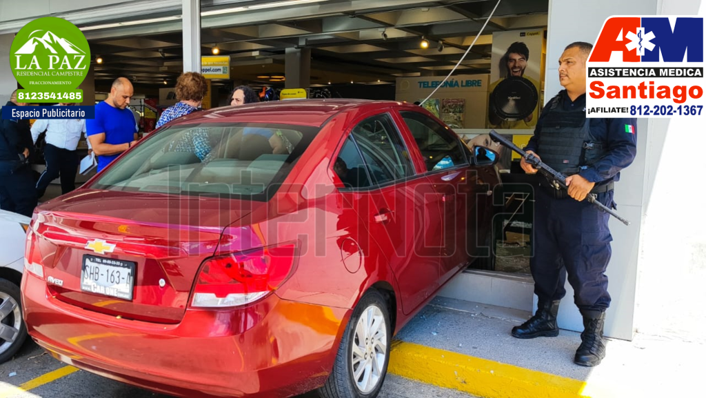 Cadereyta_ Una conductora de edad avanzada terminó junto con su auto dentro de una tienda comercial Coppel ubicada en una plaza comercial sobre la carretera Cadereyta- Allende.