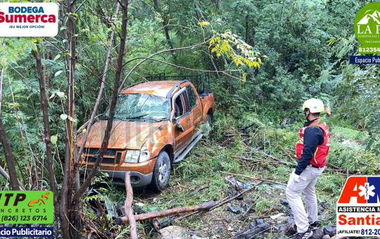 Personal de la Dirección de Protección Civil de Montemorelos al mando del comandante Héctor Parada, atienden accidente vial tipo volcadura,...