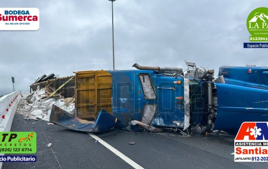 Una unidad de carga que transportaba cemento volcó sobre el puente elevado del periférico que se encuentra en la localidad...