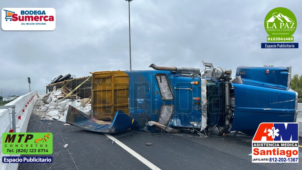 VUELCA TRAILER EN EN PUENTE DE PERIFÉRICO DE CANOAS, MONTEMORELOS.