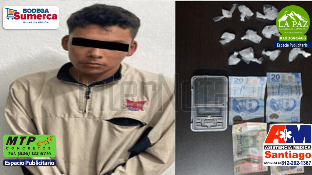 Elementos de la Secretaría de Seguridad Pública realizaron la detención de un masculino quien dijo llamarse JUAN CARLOS NN de 19 años, de apodo “El Mechas” ya que al realizarle una inspección de control preventivo tras ser detenido por incurrir en una falta administrativa sobre la Avenida Fidel Velázquez en su cruce más próximo con la calle Lic. Raúl Rangel Farías, de la colonia Antonio I. Villarreal, se le localizo entre sus ropas 12- doce envoltorios plásticos qué en su interior contenían una sustancia blanca y cristalina con las características de la droga conocida como cristal, motivo por el cual se trasladó de manera directa al Ministerio Público.