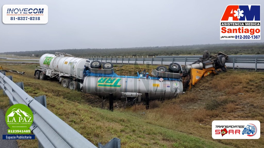 Gral. Bravo_ Una movilización por parte de Protección Civil se generó tras el reporte de una volcadura de un autotanque en la autopista de Monterrey a Reynosa sobre el Km 155, altura del municipio de General Bravo N.L.