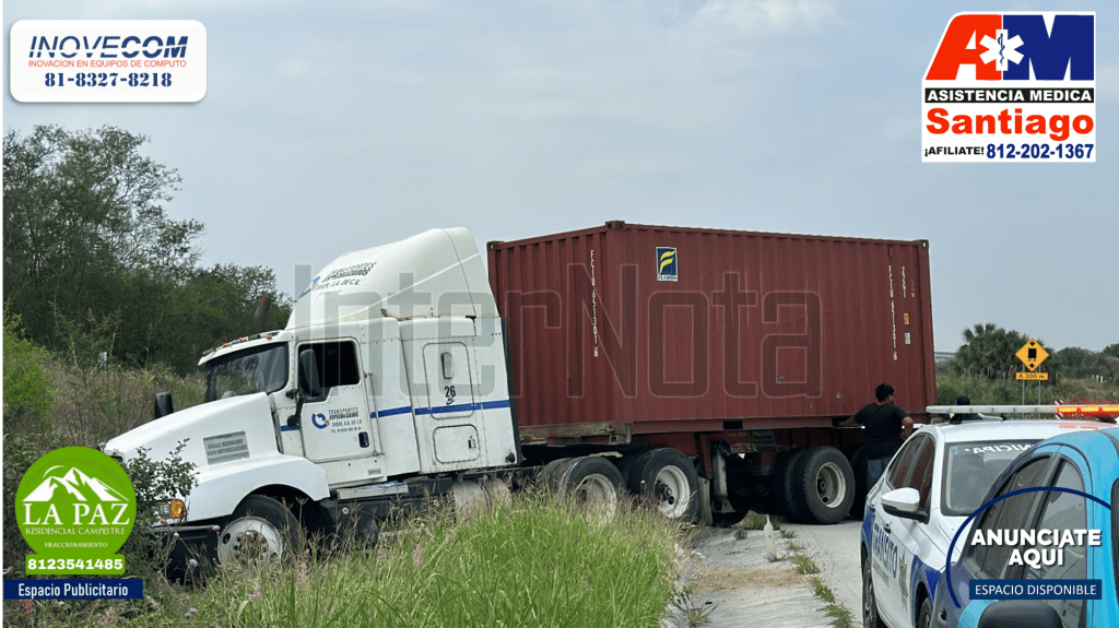Una unidad de carga que circulaba sobre el periférico de Juárez a Montemorelos salió del camino debido a una falla mecánica y termino a un costado de la validad y los remolques sobre la circulación.