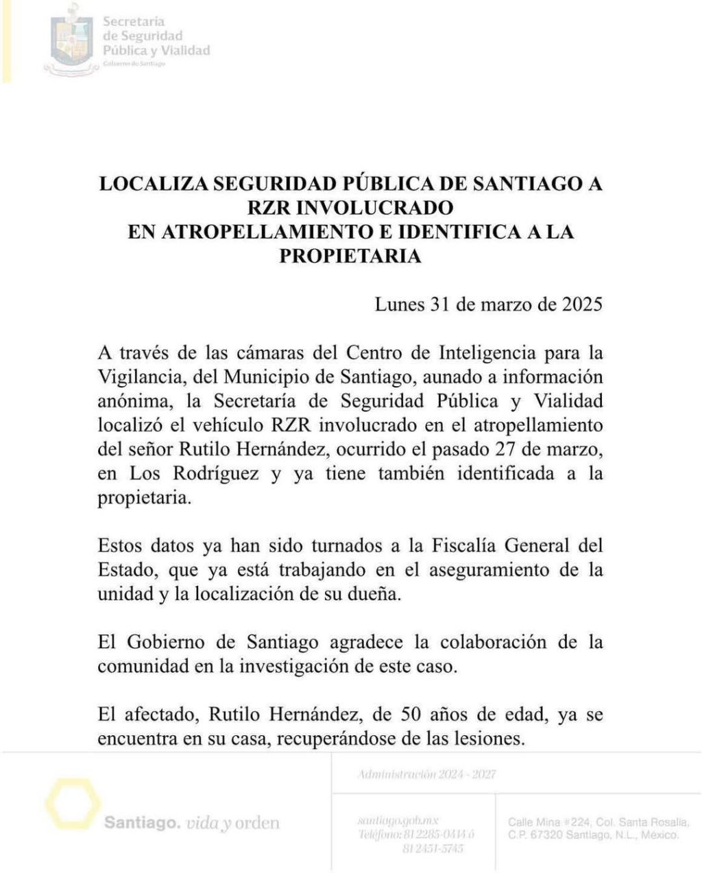 Santiago, N.L. – Gracias al sistema del Centro de Inteligencia para la Videovigilancia (CIV), las autoridades de Seguridad Pública lograron localizar el vehículo tipo RZR con el que fue atropellado un ciclista de 50 años, identificado como Rutilo Hernández.