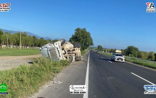 Un tráiler cargado de material triturado volcó sobre la carretera nacional a la altura del Km. 206 en Montemorelos. Protección...
