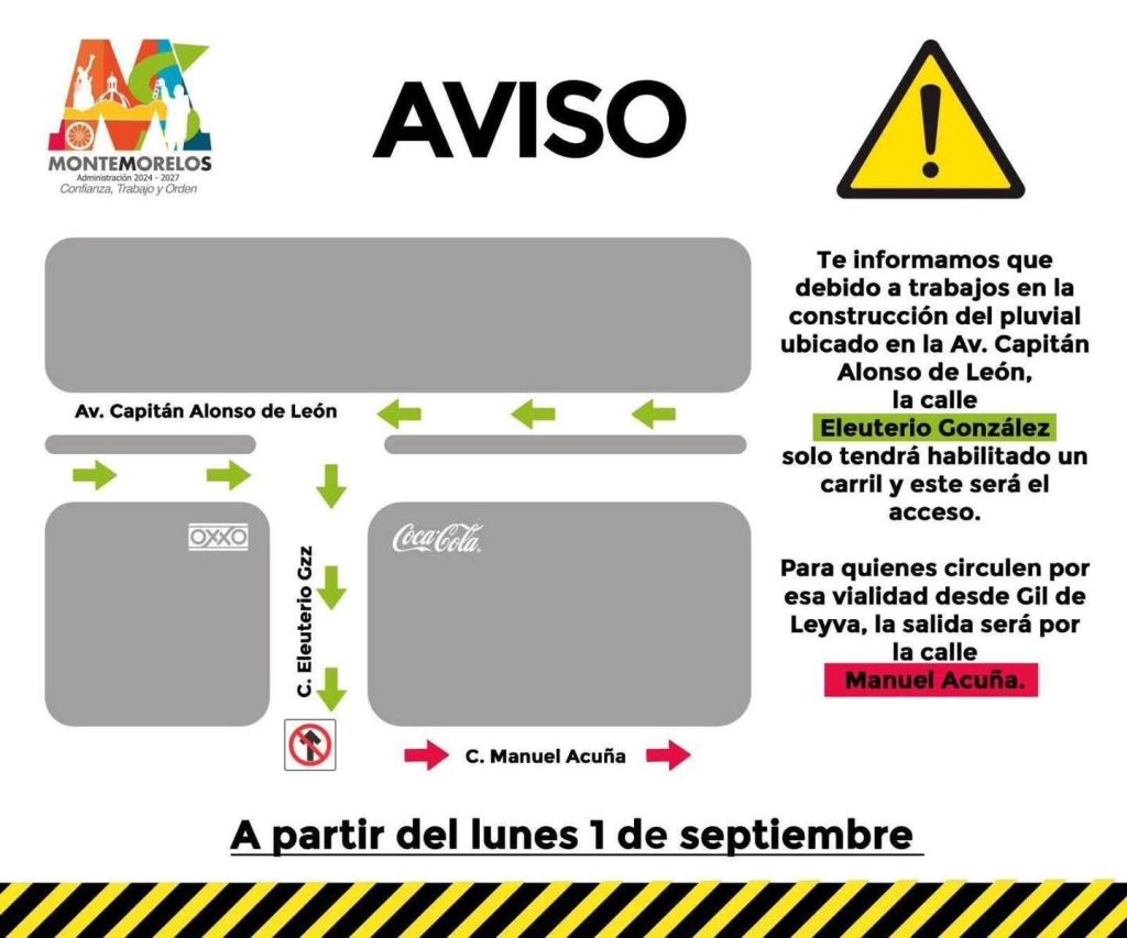 Montemorelos.- La Administración Municipal 2024 – 2027 informó que, a partir del lunes 1 de septiembre, se realizarán trabajos de construcción del pluvial en la Av. Capitán Alonso de León, lo que generará ajustes en la vialidad.