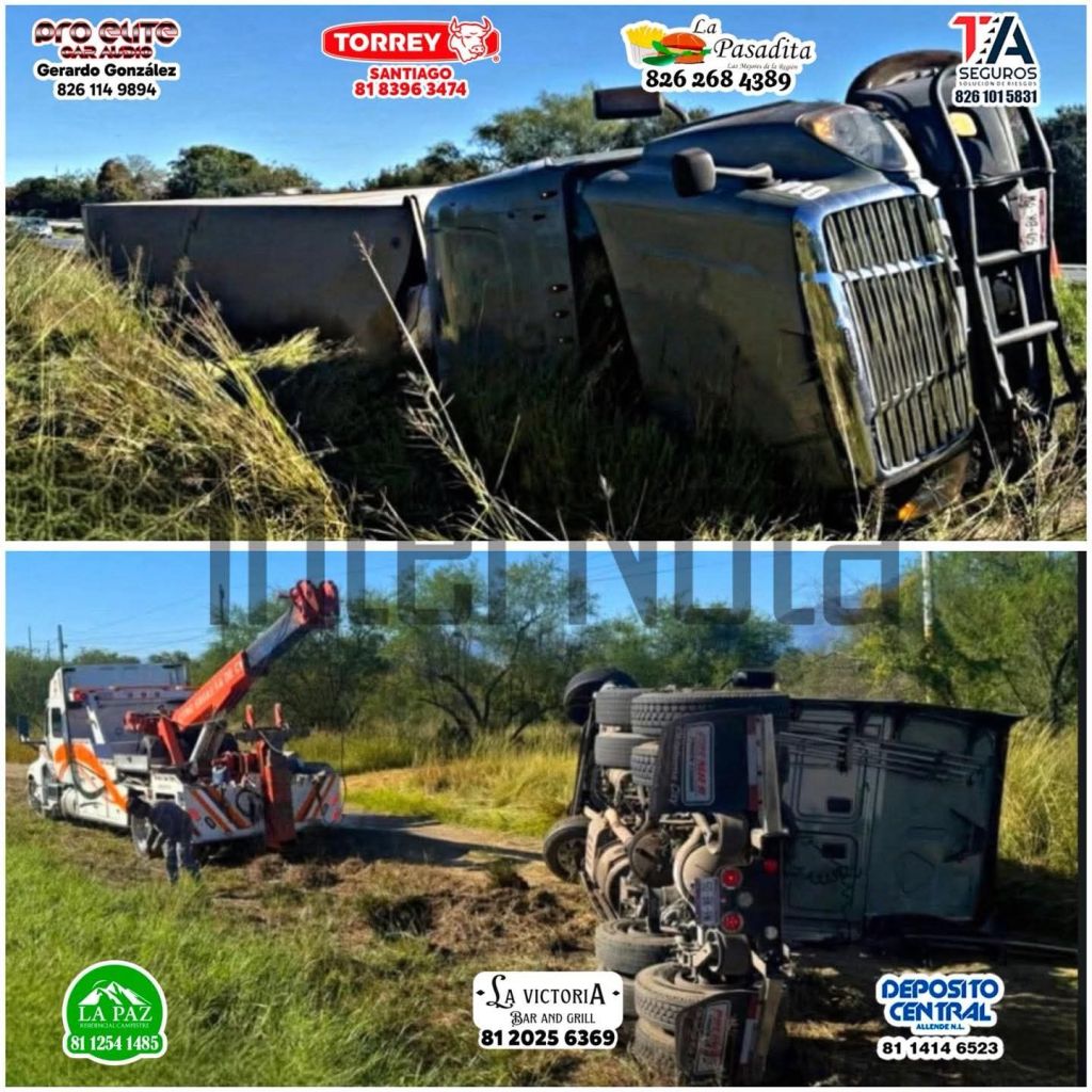 Montemorelos, N.L. – Un fuerte accidente se registró durante la madrugada sobre la carretera nacional, a la altura del kilómetro 190, en el tramo conocido como Lomalinda, donde un tráiler cargado con arroz terminó volcado.