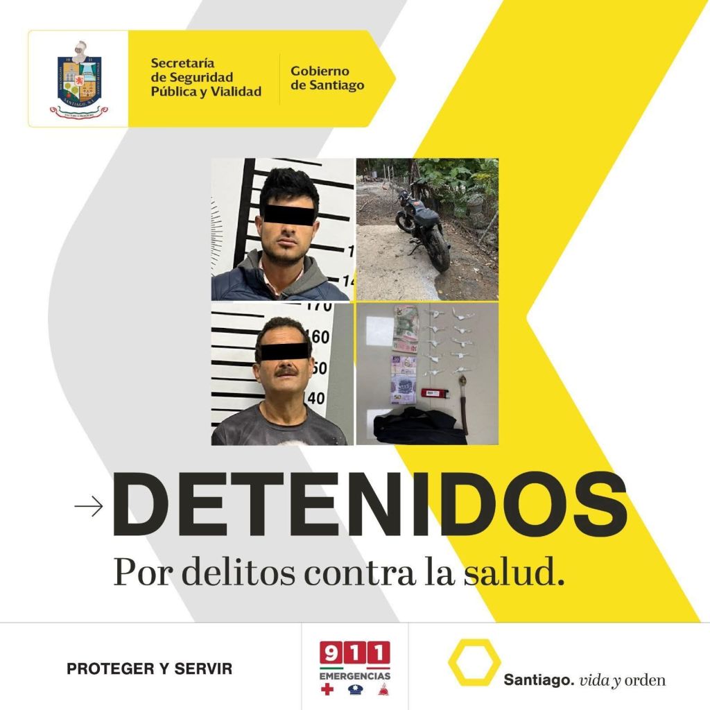 Tras protagonizar una persecución por la Carretera Nacional y calles de la Colonia Los Fierros, dos hombres que viajaban en una motocicleta sin placas y sin casco de seguridad, fueron detenidos por la Policía de Santiago por la probable comisión de delitos contra la salud.