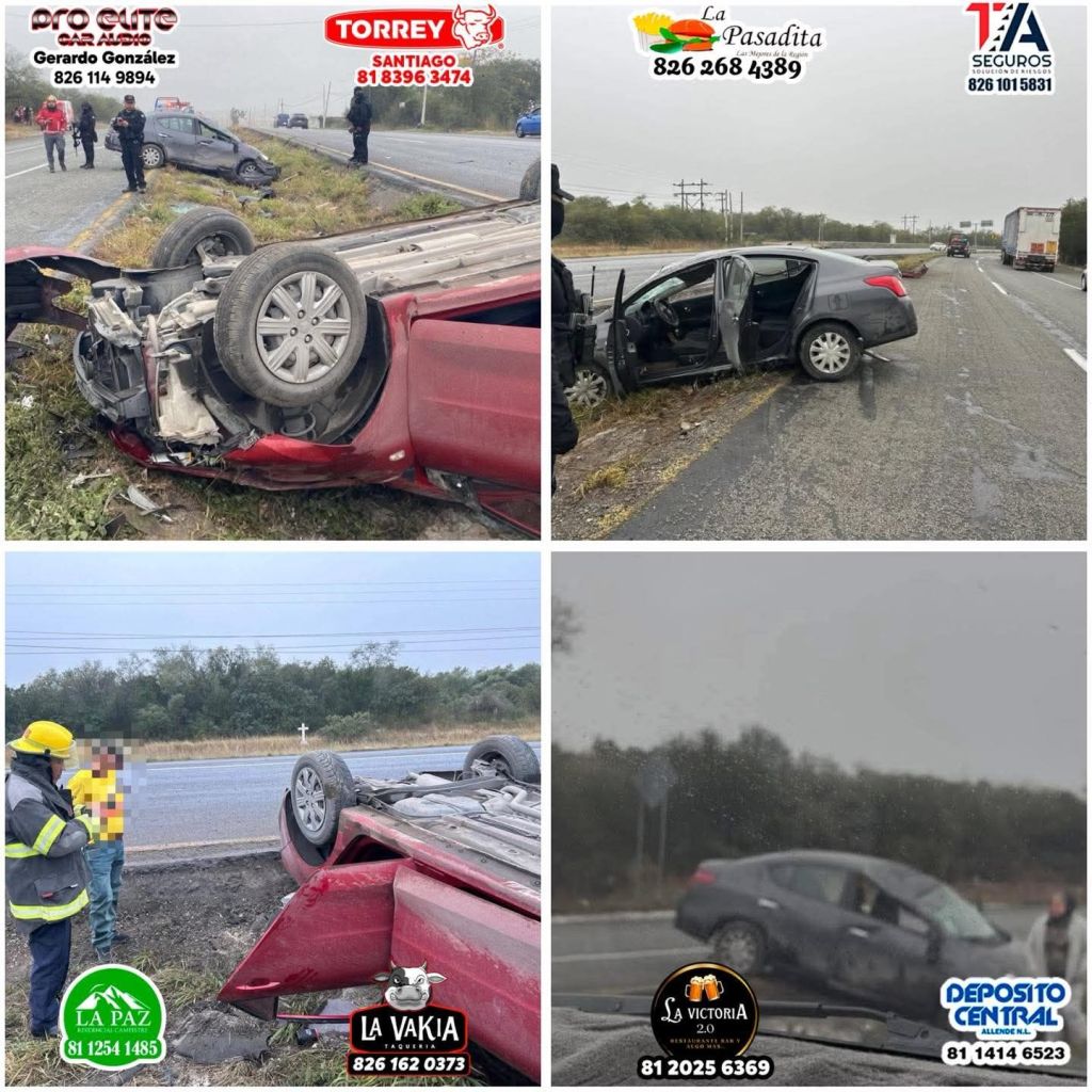 De acuerdo con reportes preliminares, un Nissan Versa terminó en el camellón central y, posteriormente, un vehículo Kia también sufrió un percance en el mismo sitio, quedando uno de los vehículos volcado. Se reporta una persona lesionada, trasladada a un hospital de Montemorelos por paramédicos de Cruz Roja.