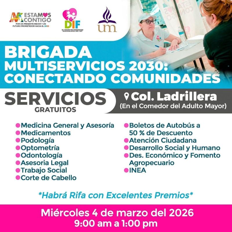 Este miércoles 4 de marzo la #BrigadaMultiservicios2030 llegará a la colonia Ladrillera📍 ¡Habrá una gran lista de servicios de salud de forma gratuita! ¡Te esperamos!
