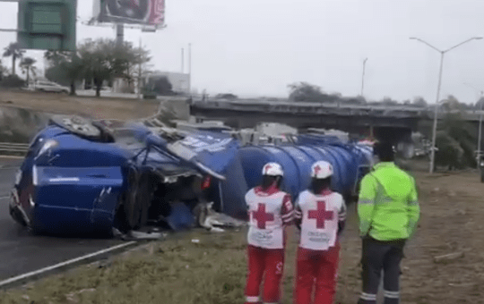 Un camión de pasajeros volcó sobre Av. Morones y Ayutla, Colonia Nuevo Repueblo en Monterrey en donde dos personas resultan...