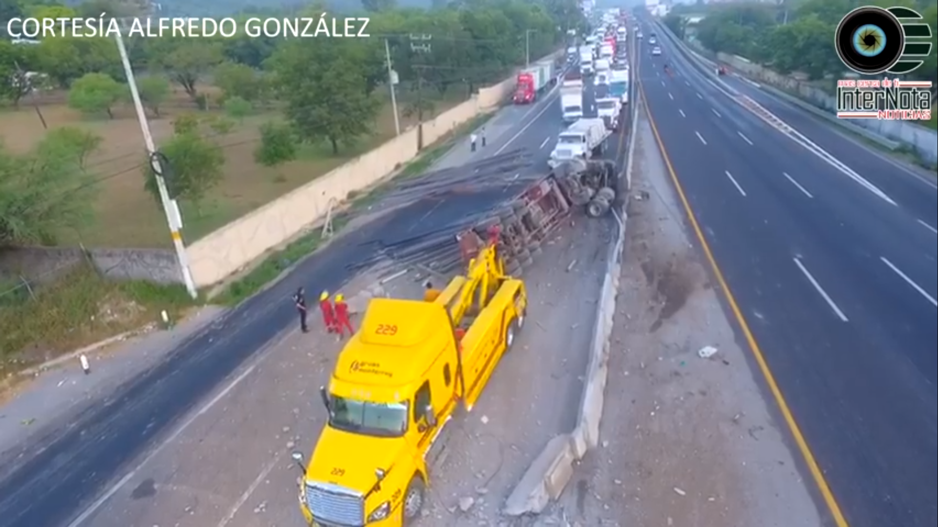 TRÁILER VUELCA Y COLAPSA VIALIDAD DE LA CARRETERA NACIONAL EN LA COMUNIDAD DEL BARRO. Santiago_ Un accidente vial tipo volcadura...
