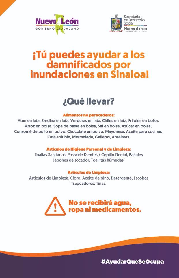 #CENTROSDEACOPIOS Apoyan a damnificados por inundaciones en Sinaloa con centros de acopios en los municipios de mty, Escobedo, García, Juárez,...