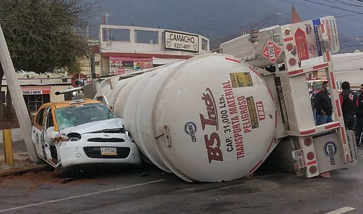 Monterrey. - Un tráiler perdió que perdió el control terminó volcado y cayó encima de un taxi, lesionando al taxista....